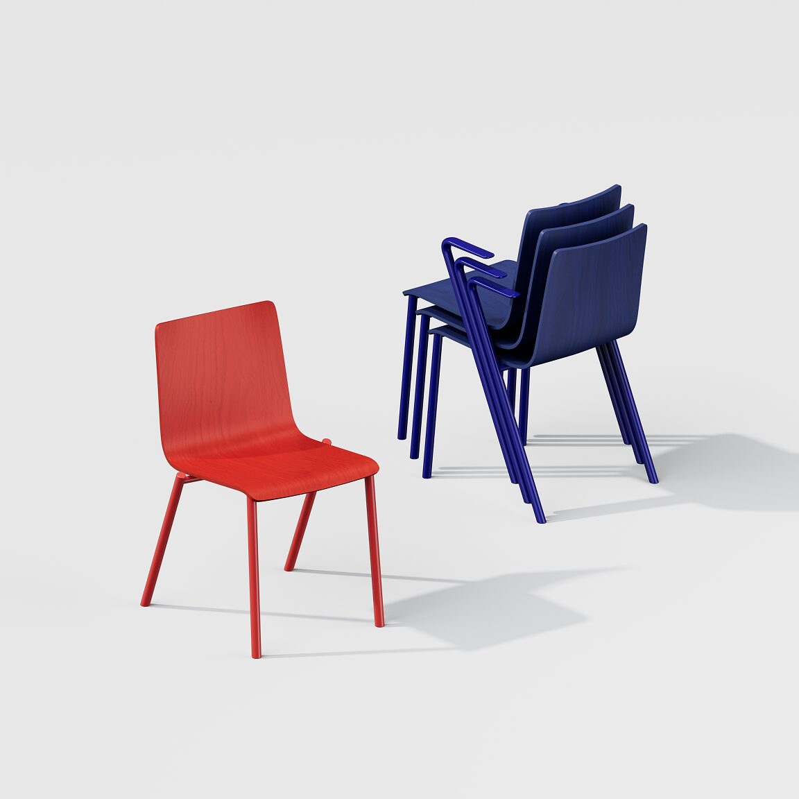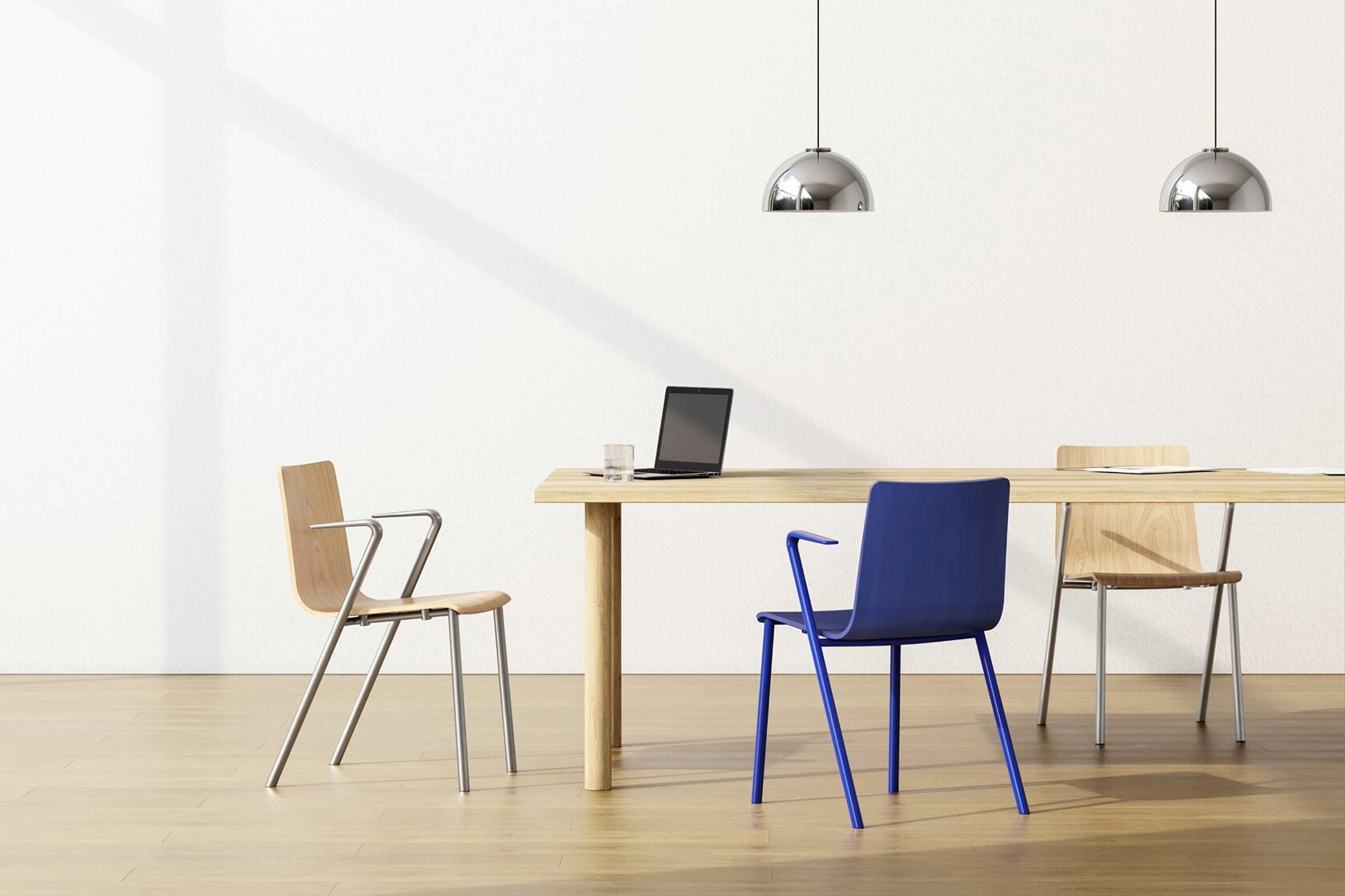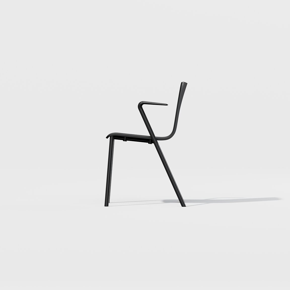 アームレストと一体化したフレームは直管で構成されており、優雅でありながらも堅牢で、動かしやすく、自由な向きで座れ、スタッキングも容易です。プレス成形の座面とウォーターフォール形状の前縁も相まって、その洗練された佇まいはスタッキングチェアの新たなアーキタイプと言えるでしょう。