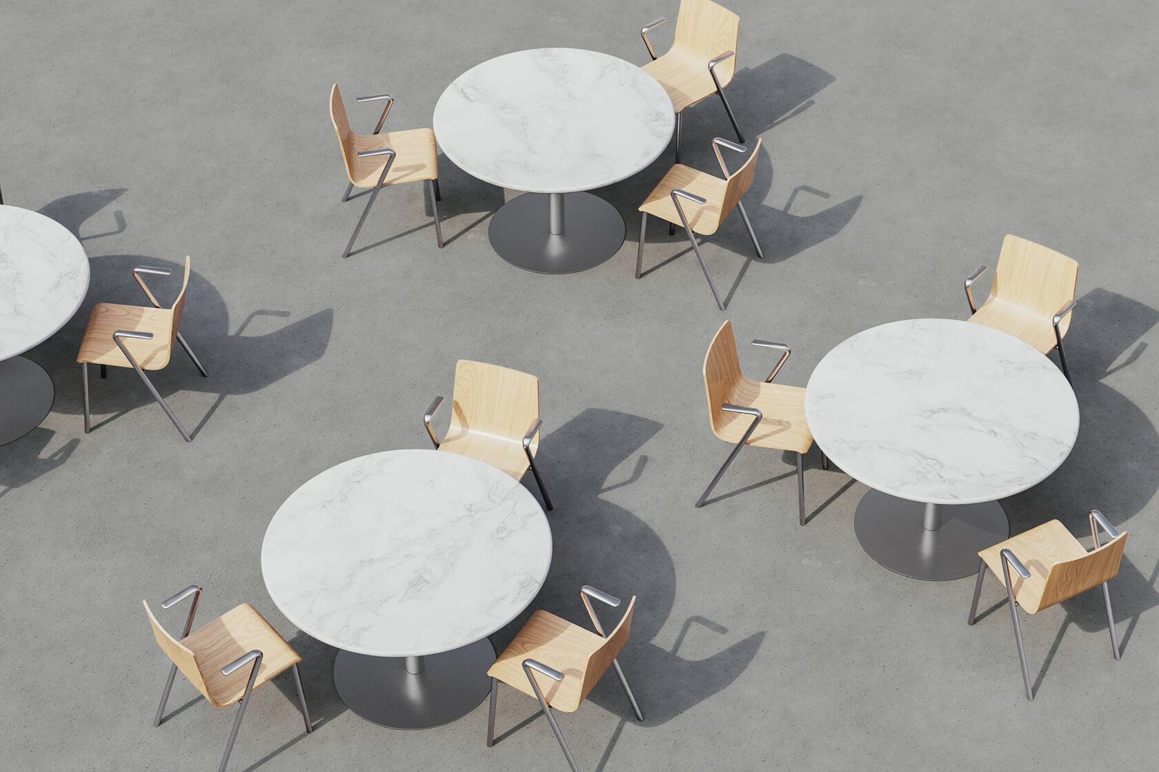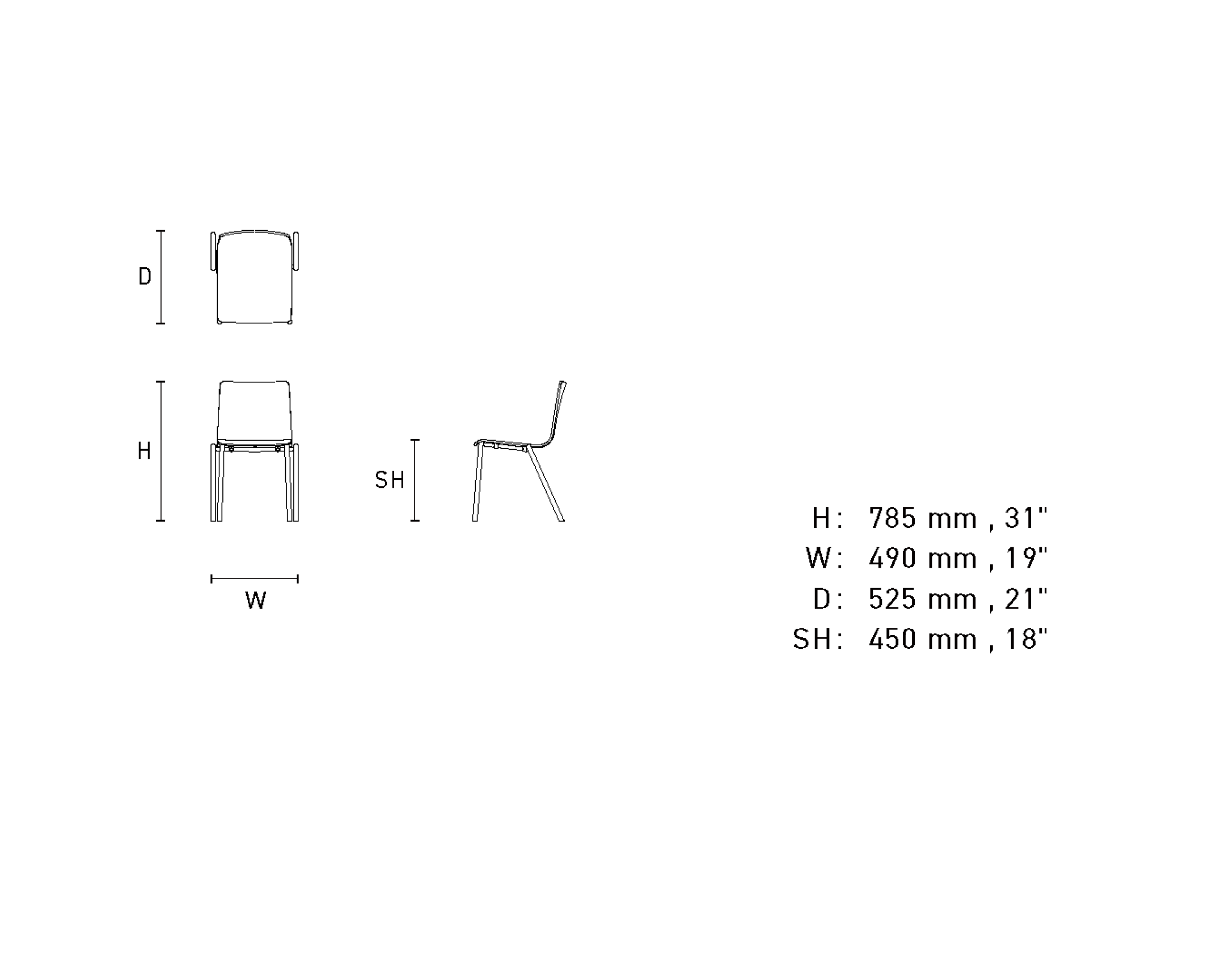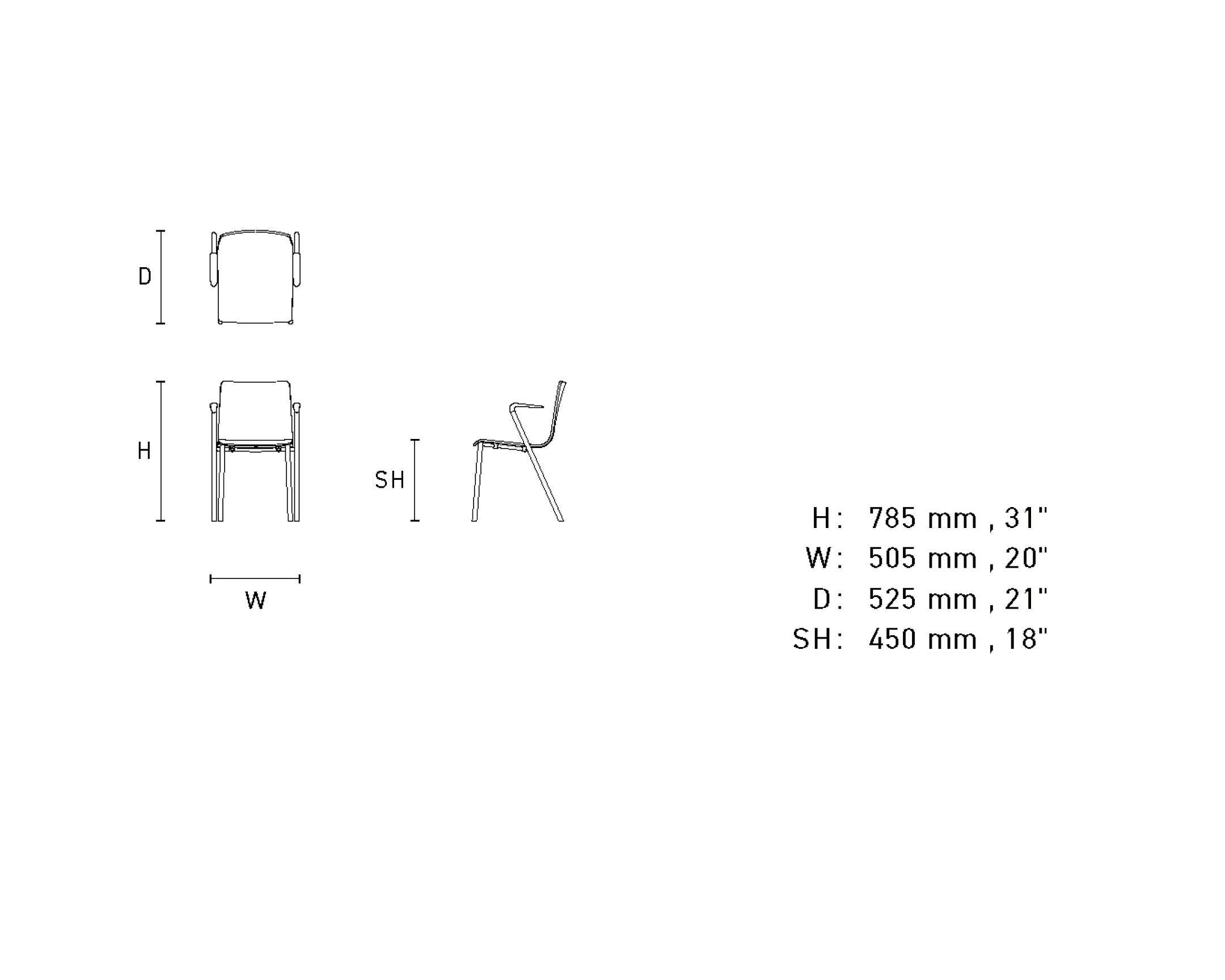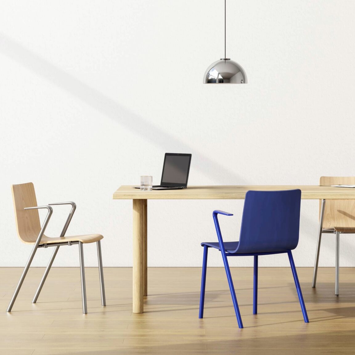 アームレストと一体化したフレームは直管で構成されており、優雅でありながらも堅牢で、動かしやすく、自由な向きで座れ、スタッキングも容易です。プレス成形の座面とウォーターフォール形状の前縁も相まって、その洗練された佇まいはスタッキングチェアの新たなアーキタイプと言えるでしょう。